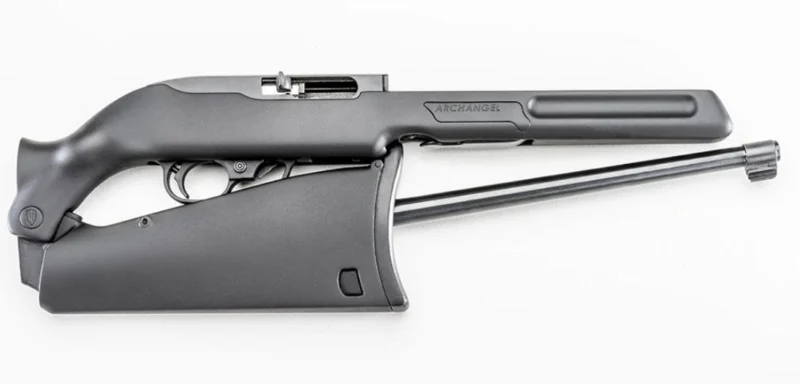 The ProMag Archangel Quick Break Down (QBD) stock converts standard Ruger 10/22 models into a quick break down design. A patent pending stainless steel V-block clamp with adjustable toggle lever facilitates rapid but precise barrel removal and installation. Clamp system repeats zero even with receiver mounted optics. The folding stock design with integrated barrel storage enables the rifle to be stored in compact spaces; perfect for campers and survivalists. The inlet features an aluminum bed block chassis embedded in a blend of high strength carbon fiber and glass filled reinforced black polymer. 18.5″ barrel minimum length is required in states that specify a minimum 26″ overall length in functioning configuration. This stock can be fired with the buttstock folded.