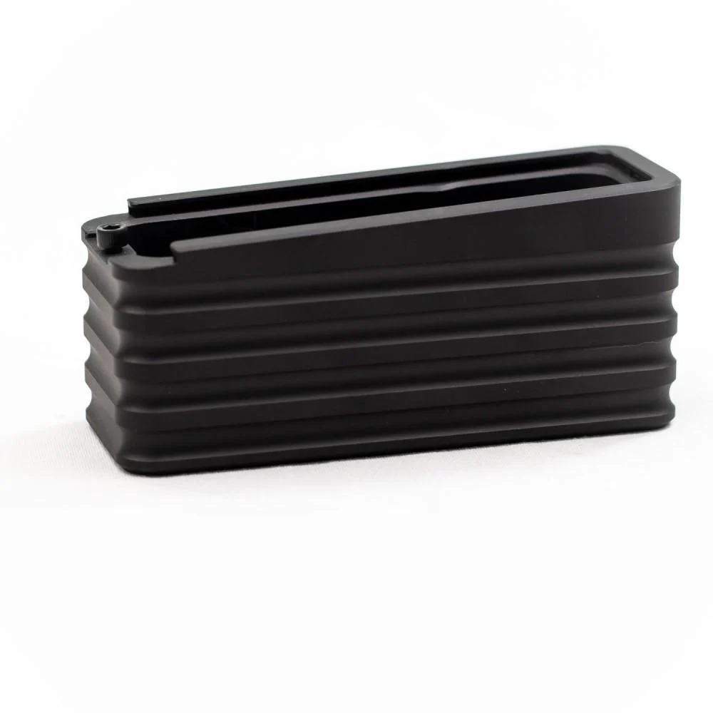 In Area419's opinion these are the only correctly made mag extensions on the market. Other magazine extensions on the market are simply rectangular blocks. If you look at your magazine the bottom is angled so when you attach a competitors extension it is not parallel with the column of cartridges in the magazine. This probably works fine for +2 rounds but it would not work for much if any more. Area419 decided to do it right and cut the attachment rail at an angle to the pocket in the mag. This means that the column of rounds travels straight down into the extension. This took extra time on the mill and they chose to cut them in one operation on the 4th axis but it was worth it to deliver to you the most advanced product of its kind. The fluting around the sides make an excellent gripping point for mag changes and also helps to remove some weight.