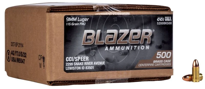 Caliber: 9mm – Bullet Type: Full Metal Jacket – Bullet Weight: 115 GR – Muzzle Energy: 323 ft lbs – Muzzle Velocity: 1145 fps – Rounds/box: 50 Rounds Per Box – 20 Boxes Per Case