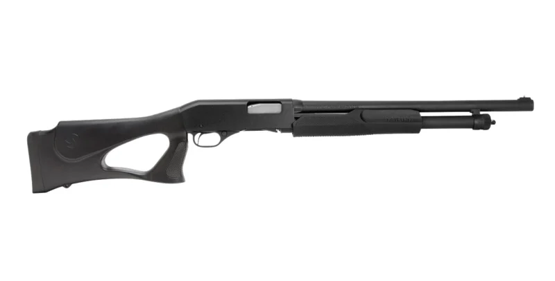 This Maverick 88 Slug model features a 3″ chamber, 6+1 capacity, 24″ blued barrel with adjustable rifle sights, and a rugged black synthetic stock and forearm.