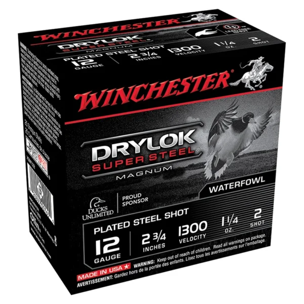 Winchester Ammunition, MFG# XSM122, UPC: 020892007659, UOM: BOX, Drylok Super Steel Magnum, 12 gauge, 2.75″ 1-1/4 oz, #2 Plated Steel Shot, 25/box, WINC, WINCAM09, WINCAMALL, AM09, AMALL, Case: 10