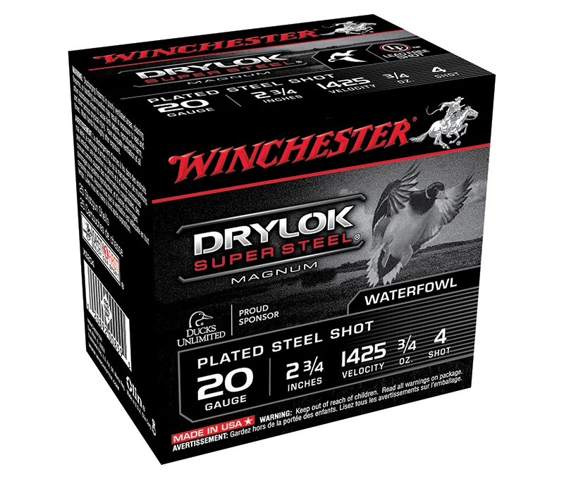Winchester Ammunition, MFG# XS204, UPC: 020892008595, UOM: BOX, Drylok Super Steel Magnum, 20 gauge, 2.75″, 3/4 oz, #4 Plated Steel Shot, 25/box, WINC, WINCAM09, WINCAMALL, AM09, AMALL, Case: 10