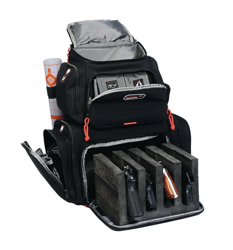 This ?free standing? backpack allows for hands free transportation to and from the range. G-Outdoors new ?Handgunner Backpack? was designed to allow the avid Handgun shooter a way to transport his Handguns 12 Extra Magazines Ammo Shooting Glasses Ear Protection Targets Stapler Tape Binos Shooting mats Cleaning Supplies all in a compact Backpack. By utilizing G-Outdoors Visual ID Storage System they have designed separate pockets that store your most frequently used items for added protection and easy retrieval. The most unique feature is the inside Storage Cradle that slides in and out of the lower compartment. This foam cradle was designed to hold 4 medium to small size handguns in a VERTICAL format. This Vertical format allows for ease of use at the range and added protection from 360 degrees. This Cradle is made of high density foam and is cut with a CNC machine to cradle each pistol by its trigger guard. Just slide out the cradle at the range and keep all 4 pistols organized. After shooting remove the cradle with the handguns inside for cleaning and then for storage in your gun safe. No need to open and close pistol cases or rugs each time you intend to use. The ?Handgunner? backpack also features a waterproof pull out cover to help keep the contents dry in case of a sudden downpour.
