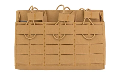 The GGG Triple 5.56 Mag Pouch will hold three 30 round M16 style 5.56 magazines. The open top design includes a bungee retention strap to allow for silent removal of your magazine. The pouch also features laser cut slots on the front and back, allowing the user to stack other modular pouches on top of it. Made of Laminate Nylon and attached to any MOLLE/PALS Style webbing with the included MALICE Clips.