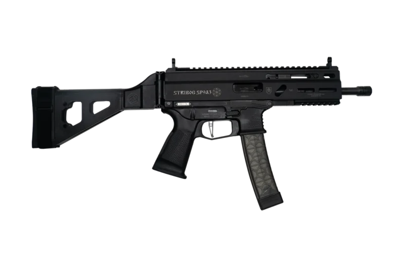 Grand Power, MFG# SP9A3-SB, UPC: 850003223117, UOM: EA, Stribog SP9A3, 9mm, 8″ Barrel, Flip-up Sights Folding SBT Brace Black, 3 30rd mags, GPWR, GPWRHG10, GPWRHGALL, HG10, HGALL