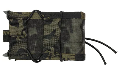 This unique pouch can securely hold most rifle caliber magazines, including 5.56mm, 7.62x39mm and .308″ and other accessories using their patent-pending combination of 1000D Cordua laminate, shock cord and injection molded polymer brackets.