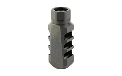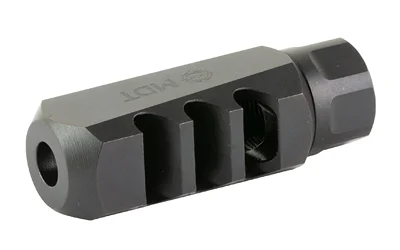 The MDT Elite Muzzle Brake reduces recoil helps you to spot impacts. The MDT Elite Muzzle Brake has 35 degree angled baffles for increased recoil reduction while keeping a more streamlined design. By reducing recoil up to 66% the follow-up shot speed and accuracy is greatly improved while a straight cut through the rear baffle reduces concussive forces. MDT Muzzle Brakes are constructed out of alloy steel with a nitride finish and are provided with an overlapping lock nut. The nut offers some tuneability, as well as the ability to index the brake to make it straight. Perfect for recoil-sensitive shooters. Must be used on threaded barrels.