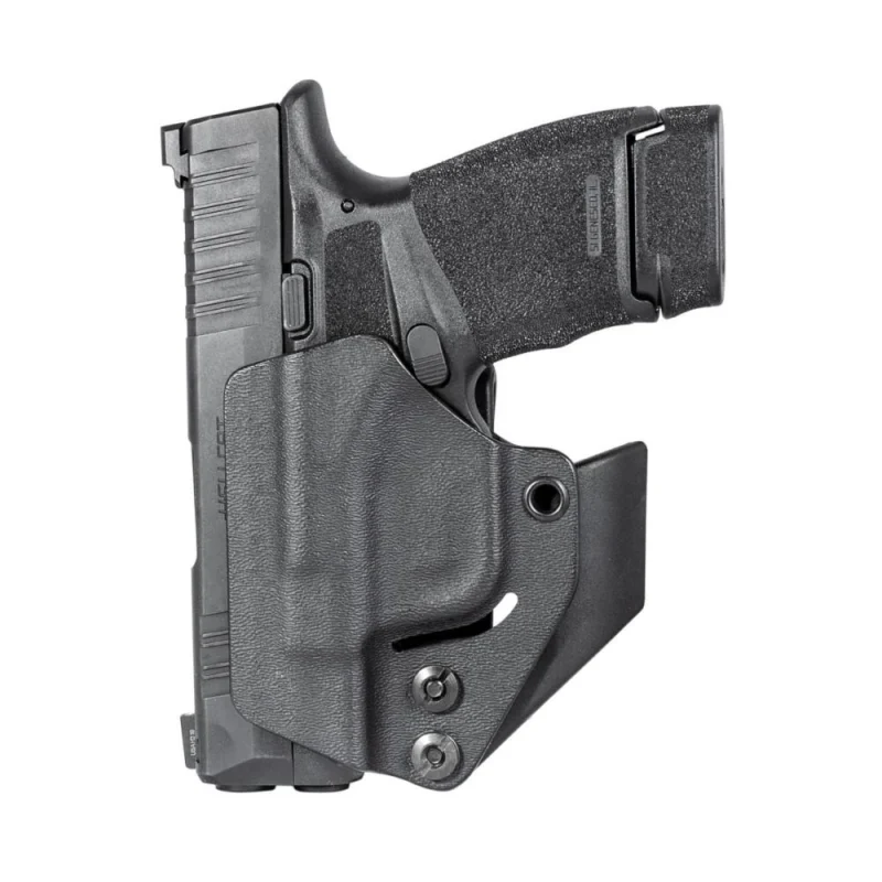 Mission First Tactical's Minimalist Holster is a low profile holster with all the performance and reliability of a full-size holster. For use Inside the Waistband (IWB) in the Appendix and 5:00 positions. Both right & left-hand positioning is accomplished with the removal of the claw and use of provided spacer. The claw for right handed shooters keeps the heel of the firearm pressed into your side minimizing its print. The famous audible click with added side retention makes each draw smooth and secure ideal for Concealed Carry. Each holster is handmade to precise tolerances for each model of handgun using the most advanced techniques and materials for an all-day comfortable carry. Holsters include a Tuckable Belt Clip that accommodates a 1-1 1/2" belt. Or remove the clip and claw and add a static-line tether keeping the trigger secure while using the firearm inside a night stand safe purse briefcase vehicle console etc.