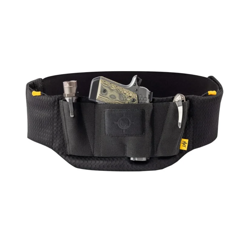 A Hard Laminate Trigger Shield protects the firearm's trigger from unwanted intrusion. The Belly Band has two Elastic pockets for spare magazine knives flashlights and pepper spray. Two Secure YKK Zippered Storage Pockets are great for credentials cash keys and can double as a phone holder.