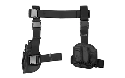 The Universal Drop Leg Holster includes thumb snap and a single mag pouch on the front. It is adjustable for drop leg height with a quick release buckle and an adjustable thigh strap with a quick release buckle. The triple magazine pouch with hook and loop mag flaps secure your pistol magazines.