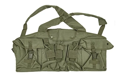 This AK Chest Rig includes three double AK Magazine pouches, with hook and loop fasteners and bungee cord retention straps, to carry up to six 30 round Magazines. There are two large Utility Pouches on each side of the chest rig with quick connect buckle flaps for storing additional ammo and gear and one central Chest compartment with button snaps for more storage.