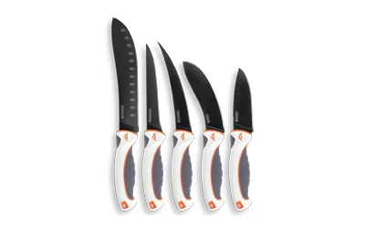 A well-rounded game processing knife set outfitted with comfortable ErgoMax handles, the Outdoor Edge ErgoMax 6-Piece Professional Grade Game Processing Knife Set makes it easier to get game to the freezer. Giving you the tools to process big game at home, this set includes an 8″ Granton Butcher knife, a 6″ Straight Boning knife, a 6″ Curved Boning knife, a 5″ Deep-Bellied Skinner knife, and a 4″ Drop-Point knife. Each knife features a 5Cr13Mov blade with a black titanium coating for unparalleled durability, superior corrosion resistance, and reduced friction. Well balanced designs, these knives come with Outdoor Edge’s ergonomically designed, grippy over-molded thermoplastic resin (TPR) ErgoMax handles for sure control and stability, even when wet. Kit comes with a 2-stage sharpener and carry case with locking clasps. Weight: 3.75 lbs.