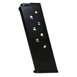 An 8-rd magazine for the 21A Bobcat pistol in .25acp. Constructed from heat-treated nickel-plated steel with a follower lock-plate and base-plate molded from a proprietary DuPont Zytel based black polymer; and using a spring wound from Chrome-silicon wire and heat-treated for strength and reliability.