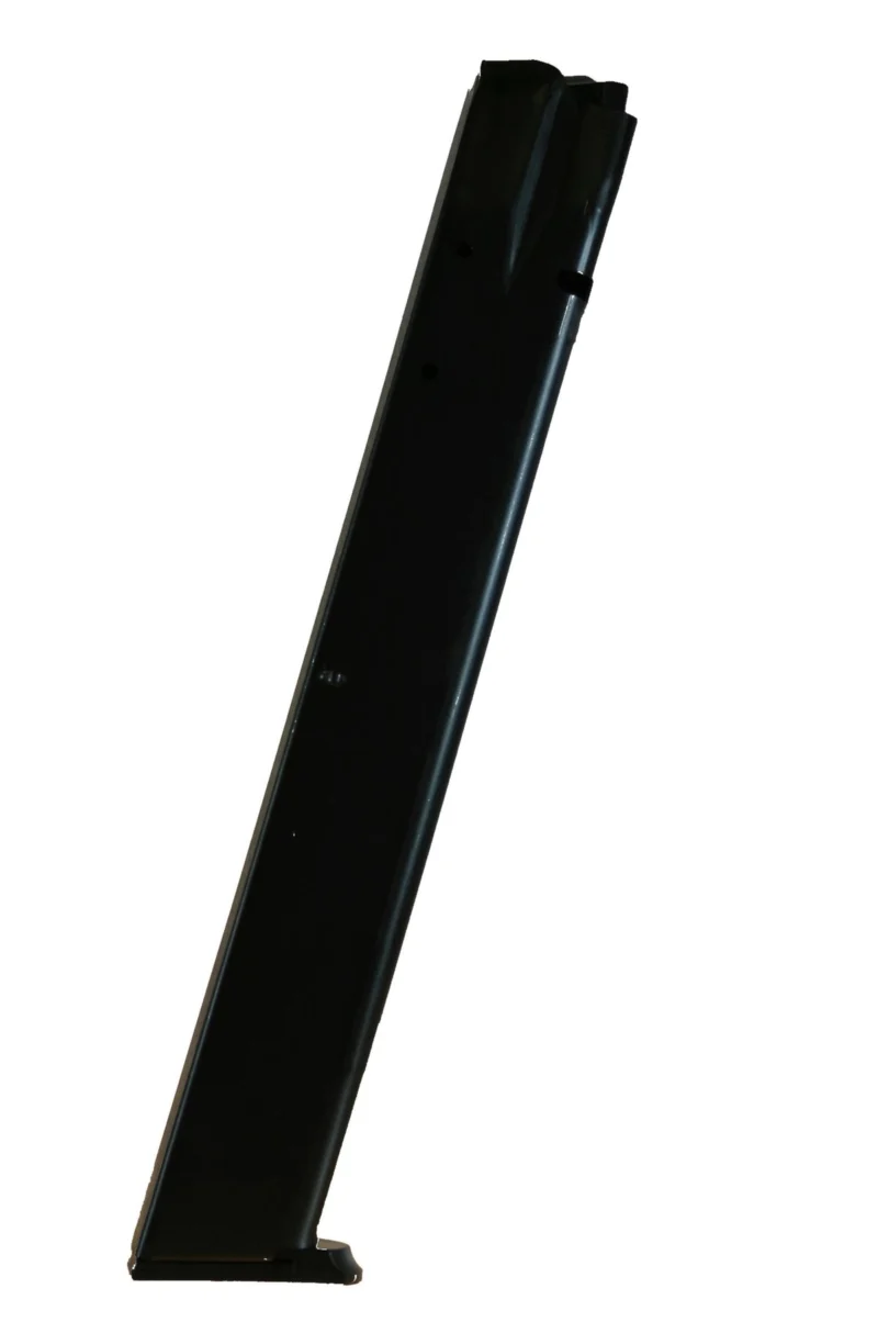 An extended 32-rd magazine for the CZ-75 / TZ-75 pistol in 9mm. Constructed from heat-treated blued-steel with a follower lock-plate and base-plate molded from a proprietary DuPont Zytel based black polymer; and using a spring wound from Chrome-silicon wire and heat-treated for strength and reliability. The magazine has an o/a length of 9.125?.Made in the U.S.A.