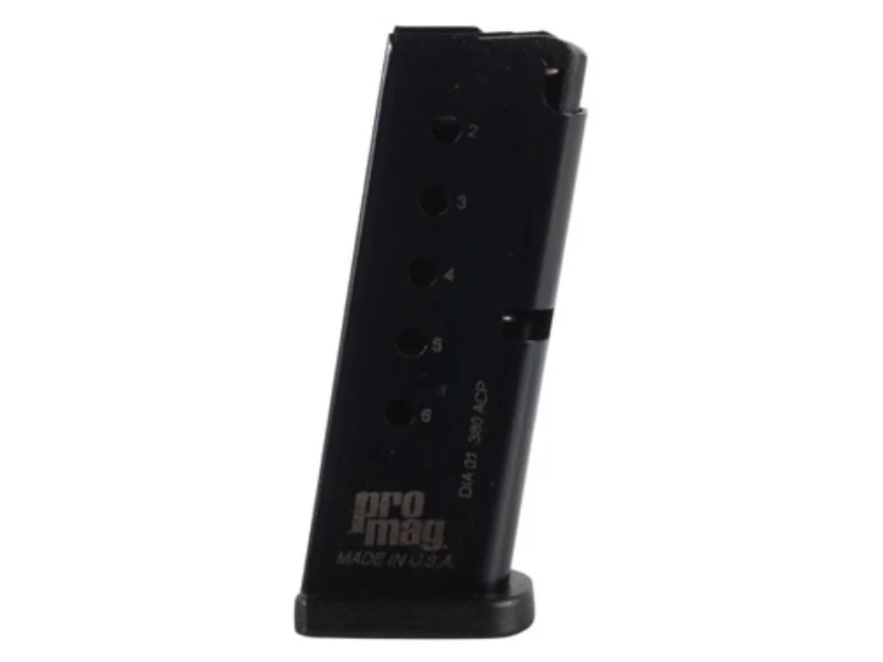 A 6-rd magazine for the Diamondback .380 pistol. The magazine body is constructed of heat treated carbon steel with a black oxide finish. A Chrome-silicon wire spring and precision molded polymer follower ensure reliable feeding and function.Made in the U.S.A.