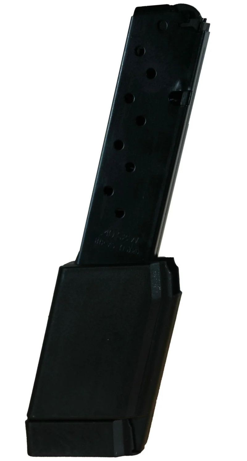 An extended (3.75_) blue-steel magazine holding 15-rounds of .40S&W ammunition for the Hi-Point 4095TS. This magazine comes with a follower bumper/base plate and comfortable grip-sleeve made of an impact-resistant black polymer material; and uses heat treated Chrome-silicon wire for reliable feeding and long spring life.