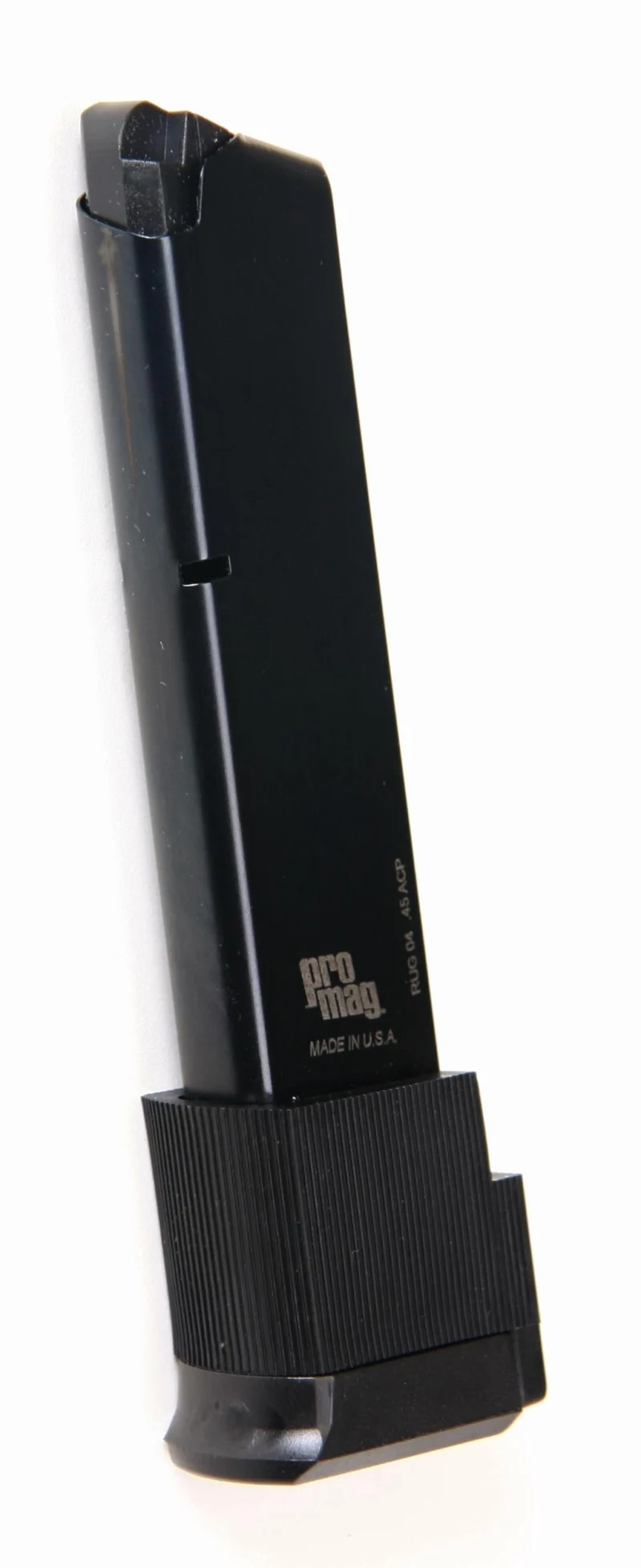 An extended 10-rd magazine for the Ruger P90/P97 pistols in .45acp. Constructed from heat-treated blued-steel with a follower lock-plate and base-plate molded from a proprietary DuPont Zytel based black polymer; and using a spring wound from Chrome-silicon wire and heat-treated for strength and reliability. Made in the U.S.A.