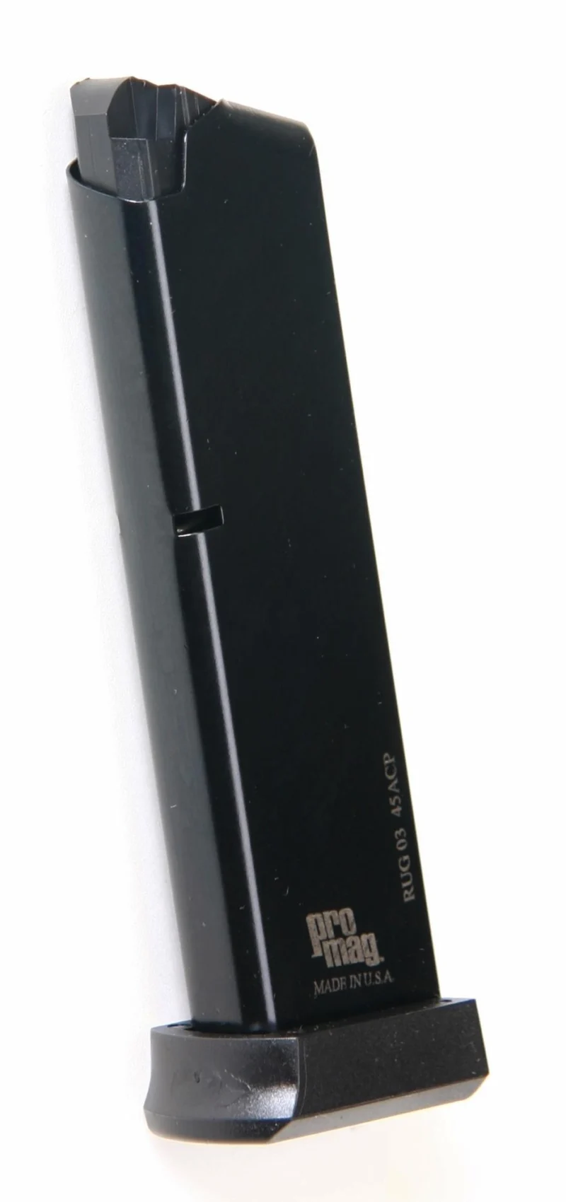 An 8-rd magazine for the Ruger P90/P97 pistols in .45acp. Constructed from heat-treated blued-steel with a follower lock-plate and base-plate molded from a proprietary DuPont Zytel based black polymer. Made in the U.S.A.