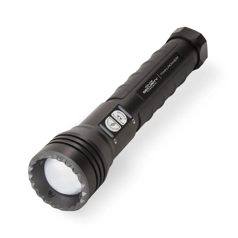 Introducing Police Security's revolutionary Twin Power Long Throw flashlight engineered to illuminate your path like never before. With an astonishing ultra-long 800-meter beam distance – that's over a half-mile of clarity – this flashlight redefines what it means to shine bright. Featuring patented technology this powerhouse is both rechargeable and compatible with alkaline batteries housed in a single cartridge giving you the ultimate choice of power with the switch of a button. With slide focus you can seamlessly adjust the beam to suit your needs whether you're navigating the wilderness or illuminating distant objects. Designed for ultimate convenience and reliability our Twin Power Long Throw flashlight comes equipped with a USB-C charging cable making recharging a breeze wherever you go. Illuminate your world with confidence and precision with Police Security's Twin Power Long Throw flashlight.