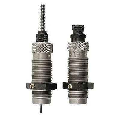 This two-die set is intended for reloading bottleneck cases and consists of a Full-Length Sizer Die with an Expander-Decapping Unit and a Seater Die with Bullet Seater Plug. The Full-Length Sizer Die brings the case to SAAMI minimum cartridge dimensions. It sizes the outside of the case de-primes and expands the neck to accept the bullet. The die has vents to prevent case damage caused by trapped air and for excessive lubricant. Headspace is held to minimum tolerances to avoid changing the case body length during full length sizing. The included Seater Die has a built-in roll crimper to secure the bullet at the same time as it