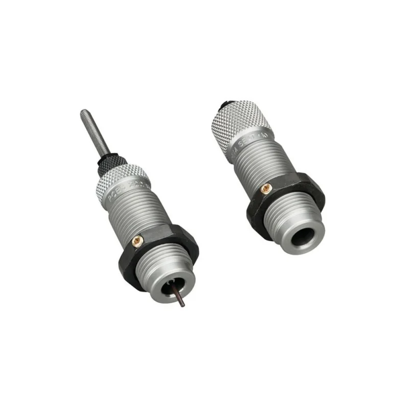 These two die-sets are intended for reloading bottleneck cases and consist of a Full-Length Sizer Die with an Expander-Decapping Unit and a Seater Die with Bullet Seater Plug. The Full-Length Sizer Die brings the case to SAAMI minimum cartridge dimensions. This die sizes the outside of the case de-primes and expands the neck to accept the bullet. The die has vents to prevent case damage caused by trapped air and excessive lubricant. Headspace is held to minimum tolerances to avoid changing the case body length during full-length sizing. The included Seater Die has a built-in roll crimper to secure the bullet at the same time as it's seated