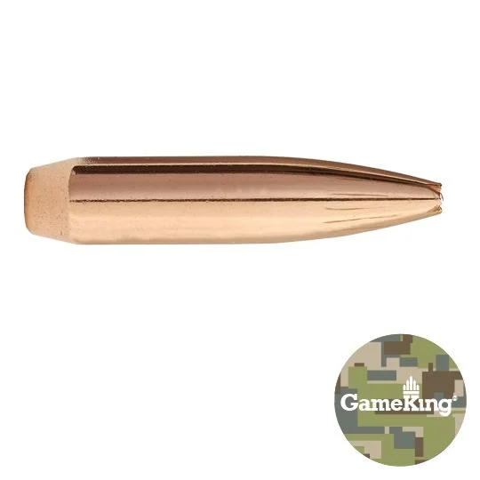 The 160 grain #1925 Sierra Gameking Hollow Point Boat Tail is a true magnum bullet being somewhat "tougher" than the #1920 for deeper penetration. Contrary to a usual assumption this hollow point bullet is not particularly fragile. The nose opening is closed slightly to help retard initial upset but even expansion is assured by four skives cut into the jacket. Of course there is no exposed lead to be deformed in the magazine. The result is an excellent bullet for many big game applications.