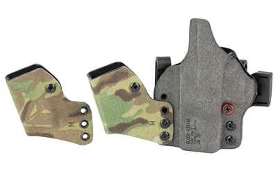 An ergonomic, mission-adjustable, RDS-compatible, multi-positional, deep concealment IWB hybrid thermoplastic holster. Its distinctive features enable concealed carry for a wide range of handgun fits from various carry positions while allowing a full firing grip prior to drawing. The design includes passive retention and adjustable tension, enabling a finely tuned fit and smooth draw. This evolution of the IncogX features a series of clips that provide more adaptability to the user while maintaining the original goals of improved grip, concealment, and function. The clips open outward and slide down with the holster, naturally locking over the belt. An actuated finger tab flexes to open, allowing quick installation or removal from the belt. An improved clip strut design combines functionality with customized concealment shims that can be easily installed or removed without tools. All IncogX models come with clip strut shims in three different concealment sizes: 1/8″, 1/4″, and 3/8″.