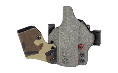 An ergonomic, mission-adjustable, RDS-compatible, multi-positional, deep concealment IWB hybrid thermoplastic holster. Its distinctive features enable concealed carry for a wide range of handgun fits from various carry positions while allowing a full firing grip prior to drawing. The design includes passive retention and adjustable tension, enabling a finely tuned fit and smooth draw. This evolution of the IncogX features a series of clips that provide more adaptability to the user while maintaining the original goals of improved grip, concealment, and function. The clips open outward and slide down with the holster, naturally locking over the belt. An actuated finger tab flexes to open, allowing quick installation or removal from the belt. An improved clip strut design combines functionality with customized concealment shims that can be easily installed or removed without tools. All IncogX models come with clip strut shims in three different concealment sizes: 1/8″, 1/4″, and 3/8″.