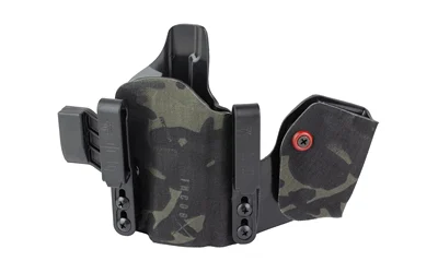An ergonomic, mission-adjustable, RDS-compatible, multi-positional, deep concealment IWB hybrid thermoplastic holster. Its distinctive features enable concealed carry for a wide range of handgun fits from various carry positions while allowing a full firing grip prior to drawing. The design includes passive retention and adjustable tension, enabling a finely tuned fit and smooth draw. This evolution of the IncogX features a series of clips that provide more adaptability to the user while maintaining the original goals of improved grip, concealment, and function. The clips open outward and slide down with the holster, naturally locking over the belt. An actuated finger tab flexes to open, allowing quick installation or removal from the belt. An improved clip strut design combines functionality with customized concealment shims that can be easily installed or removed without tools. All IncogX models come with clip strut shims in three different concealment sizes: 1/8″, 1/4″, and 3/8″.