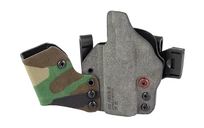 An ergonomic, mission-adjustable, RDS-compatible, multi-positional, deep concealment IWB hybrid thermoplastic holster. Its distinctive features enable concealed carry for a wide range of handgun fits from various carry positions while allowing a full firing grip prior to drawing. The design includes passive retention and adjustable tension, enabling a finely tuned fit and smooth draw. This evolution of the IncogX features a series of clips that provide more adaptability to the user while maintaining the original goals of improved grip, concealment, and function. The clips open outward and slide down with the holster, naturally locking over the belt. An actuated finger tab flexes to open, allowing quick installation or removal from the belt. An improved clip strut design combines functionality with customized concealment shims that can be easily installed or removed without tools. All IncogX models come with clip strut shims in three different concealment sizes: 1/8″, 1/4″, and 3/8″.