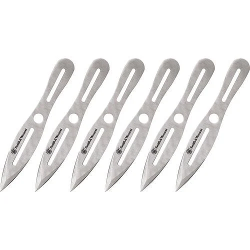 Smith & Wesson® 6 pack of 8" throwing knives are made out of stainless-steel dual edged spear point blades. Included is a black polyester belt sheath.