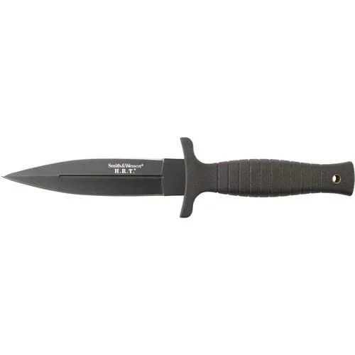 The Smith & Wesson® H.R.T. Full Tang Fixed Blade Knife is made out of a black high carbon stainless-steel dual-edged spear point blade with blood grooves. Its TPE rubber wrapped handle comes with lanyard hole and black leather belt/boot sheath; Note: Does not sell in CA NY MA.