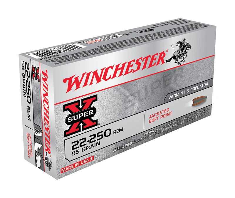 Winchester Ammunition, MFG# X222501, UPC: 020892200029, UOM: BOX, Super-X, 22-250 Rem, 55 grain, Jacketed Soft Point, 20/box, WINC, WINCAM30, WINCAMALL, AM30, AMALL, Case: 10